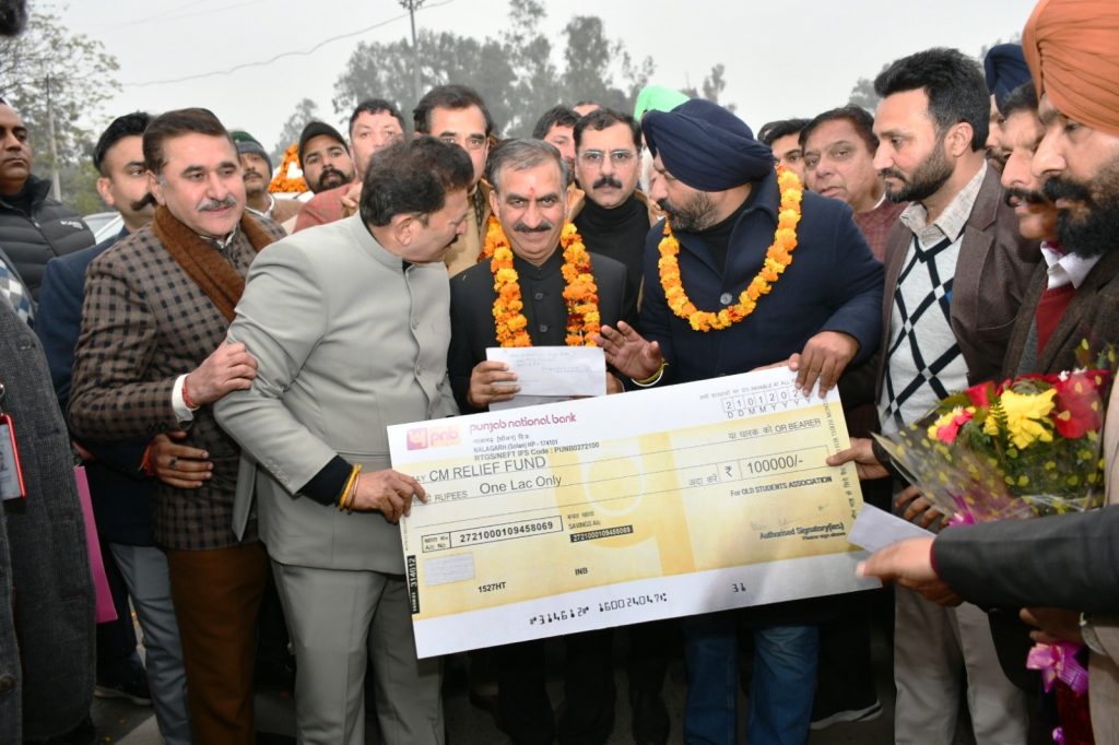 मुख्यमंत्री को पी.जी. कॉलेज नालागढ़ ओल्ड स्टूडेंट्स ऐसोसिएशन की ओर से एक लाख रुपये का चेक आपदा राहत कोष के लिए भेंट किया गया।