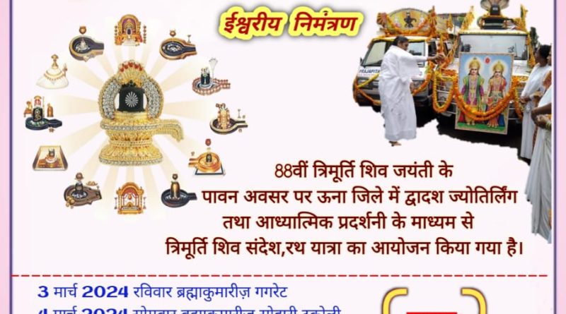 ऊना जिला मैहतपुर ब्रह्मकुमारीज द्वारा महाशिवरात्रि महोत्सव के उपलक्ष्य में त्रिमूर्ति शिव संदेश रथ यात्रा तथा ध्वजारोहण का आयोजन जिला में 3 मार्च से 8 मार्च के बीच किया जा रहा है। जोकि सप्ताह भर जिला के गगरेट, सोहारी टकोली, मैहतपुर, लमलेहड़ा, दुलैहड़ व रक्कड़ कॉलोनी से प्रारम्भ होकर विभिन्न गांवों में जा कर ईश्वरीय संदेश देगी।यह जानकारी देते हुए ब्रह्मकुमारी बबिता बहन ने बताया कि 88 वीं त्रिमूर्ति शिव जयंती के पावन अवसर पर ऊना जिला में द्वादशं ज्योतिलिंग तथा आध्यात्मिक प्रदर्शनी कें माध्यम सें त्रिमूर्ति शिव संदेश रथ यात्रा द्वारा स्वयं व परमपिता परमात्मा की पहचान तथा शिवरात्रि का अदभुद रहस्य व प्राचीन राजयोग मैडीटेशन के द्वारा फिर से रामराज्य की स्थापना का संदेश दिया जाएगा। मानव कल्याण व आध्यात्मिक उन्नति के साथ सुखद व खुशहाल जीवन बनाने के लिए सहज राजयोग के रहस्य का प्रशिक्षण निशुल्क देने का आवाह्न किया जा रहा हैं।