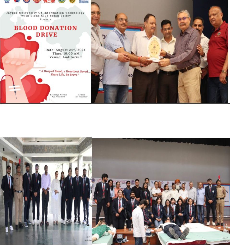 BLOOD DONATION DRIVEOn August ,24 2024, the GCC and Omega Leo Club of Waknaghat, in collaboration with the Lions Valley Club of Solan, organized a monumental Blood Donation Drive at the Jaypee University of Information Technology